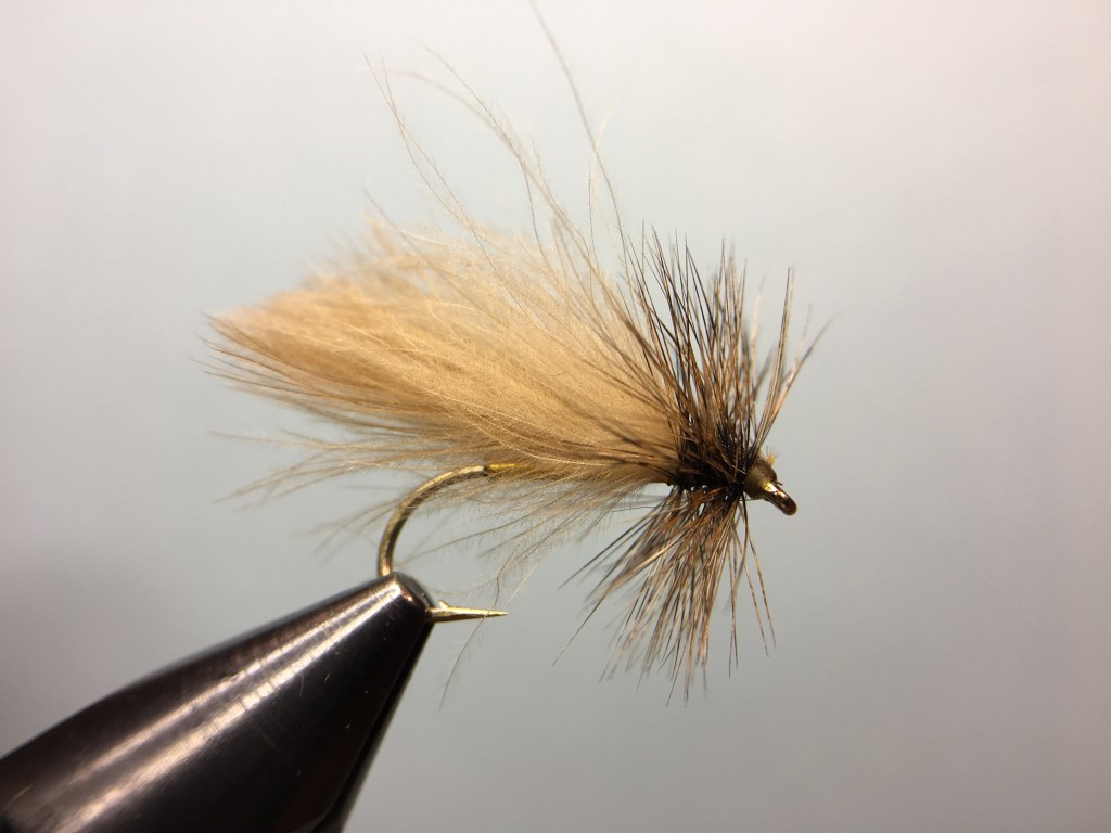 Sitting at my folks’ kitchen table after the girls were asleep for the night. I experimented with this and that, and what became my staple for the rest of the summer caddis hatch was beautifully simple and effective. Nothing revolutionary. Just a big CDC caddis. Dai-Riki 320 size 8 hook, gold tinsel body, four CDC feathers as a down wing, and front collar of golden badger or speckled badger hackle. I’m a big fan of Trouthunter CDC for these big buoyant wings, in natural tan and dyed caddis dun colors. I don’t know that color is that important – profile, buoyancy and wake are likely the important part – but I’m the type of guy who likes having a Plan B in case Plan A doesn’t work out. The finished fly is roughly half again as long as the actual caddis, but an oversized fly has never been an issue for me during this hatch and only helps to (so I believe) make the fly more visible in the almost guaranteed wind chop on the water. It’s all about the chug-chug-chug wake.